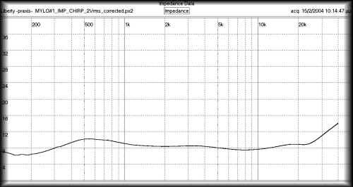 A special impedance correction circuit was engaged in parallel to Mylo's crossover network, to render the latter's impedance as resistive as possible in a wide frequency range. This sub-circuit is shown within the crossover network schematic just above. Its 'healing' properties can easily be understood in the following impedance graph: