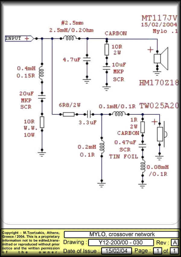 At lower frequencies where large impedance resonant peaks occur to absolutely all loudspeaker systems (up to 40 or more Ohms !) such correction circuits demand extremely large inductance and capacitance values and therefore are not feasible. Mylo's impedance correction circuit is surely a decisive step towards sonic perfection, especially for those who do not own highly expensive amplifiers.