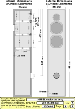 Nimiel enclosure adopts extensive bracing and a net volume of some 47 litres for deep but well controlled bass reproduction. Almost 1 m2 (!) of tar sheets take care of wall oscillations and an equal amount of 'ricofon' (TM) absorbing material provide more than adequate suppression of internal standing waves and resonances.